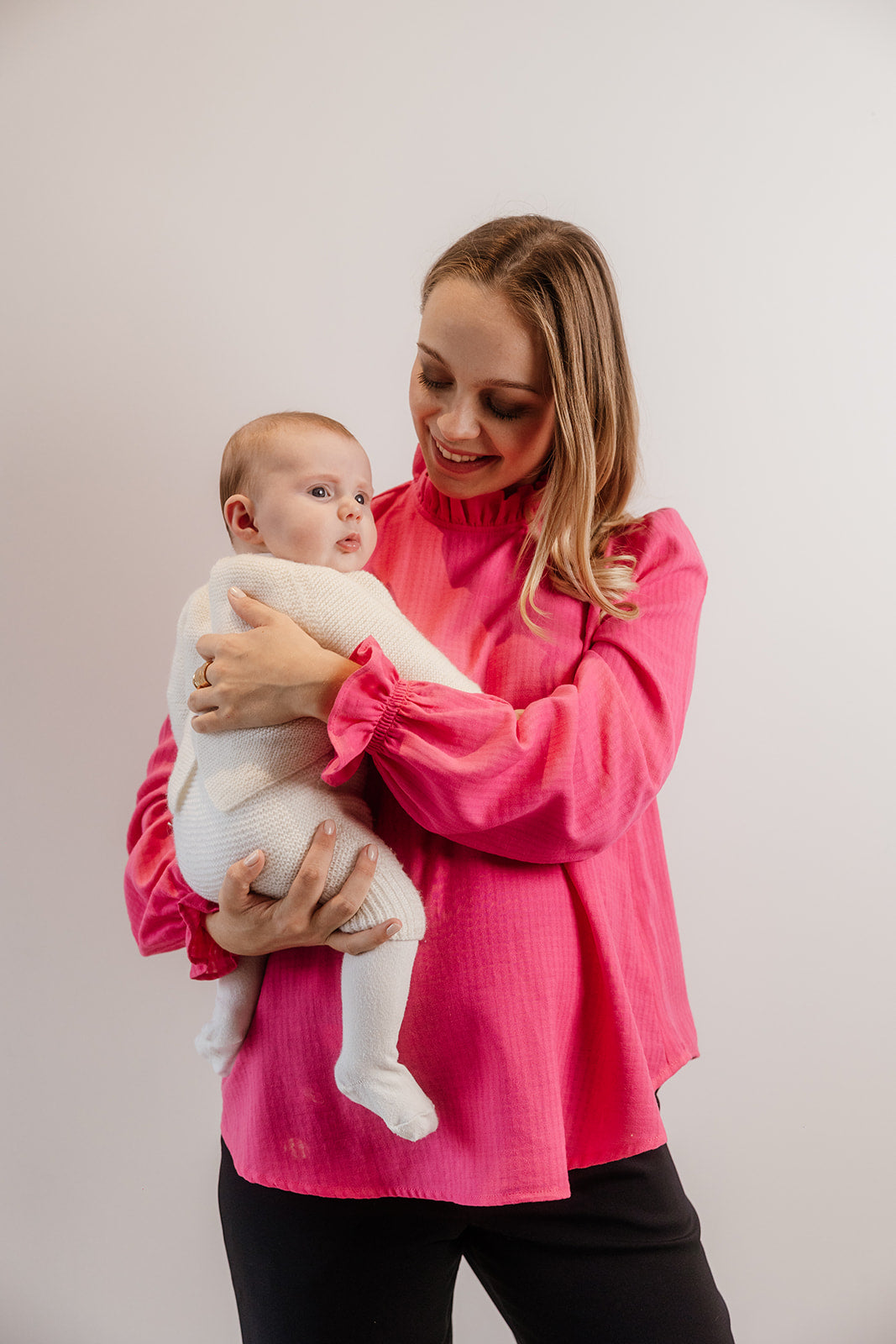 Dank seiner hübschen Trapezsilhouette kann es während der Schwangerschaft, Stillzeit und jeden Tag danach getragen werden. Die langen Ärmel sind an den Manschetten gesmokt, ein elegantes, raffiniertes und praktisches Detail.